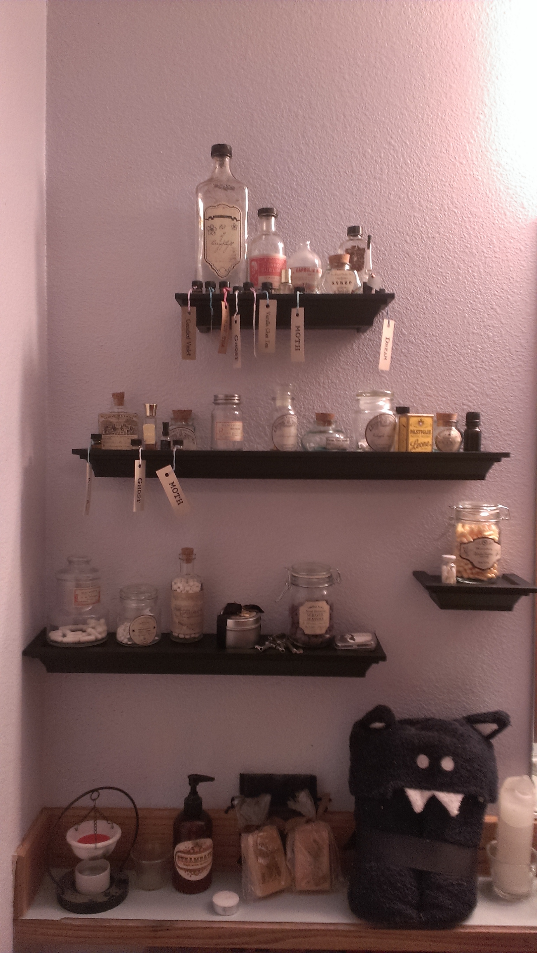 Outfitting yourself with a cool accessory is a powerful coping mechanism, I’m finding. I feel SO much better about my pills and pills and pills since I made the apothecary shelves with them. OH!! I haven’t showed you that lately! I have Apothecabinet Mark II now. Separate post. Yep. It’s like consoling yourself to go through chemo by thinking about all the awesome wigs you can get and have a different hairstyle whenever you feel like it. I have to take a lot of damned medicines, but I feel better about it dispensing them all from little awesome jars. Yeah, I’ll have to walk with a cane eventually, but it’s gonna be an awesome accessory, besides being functional.