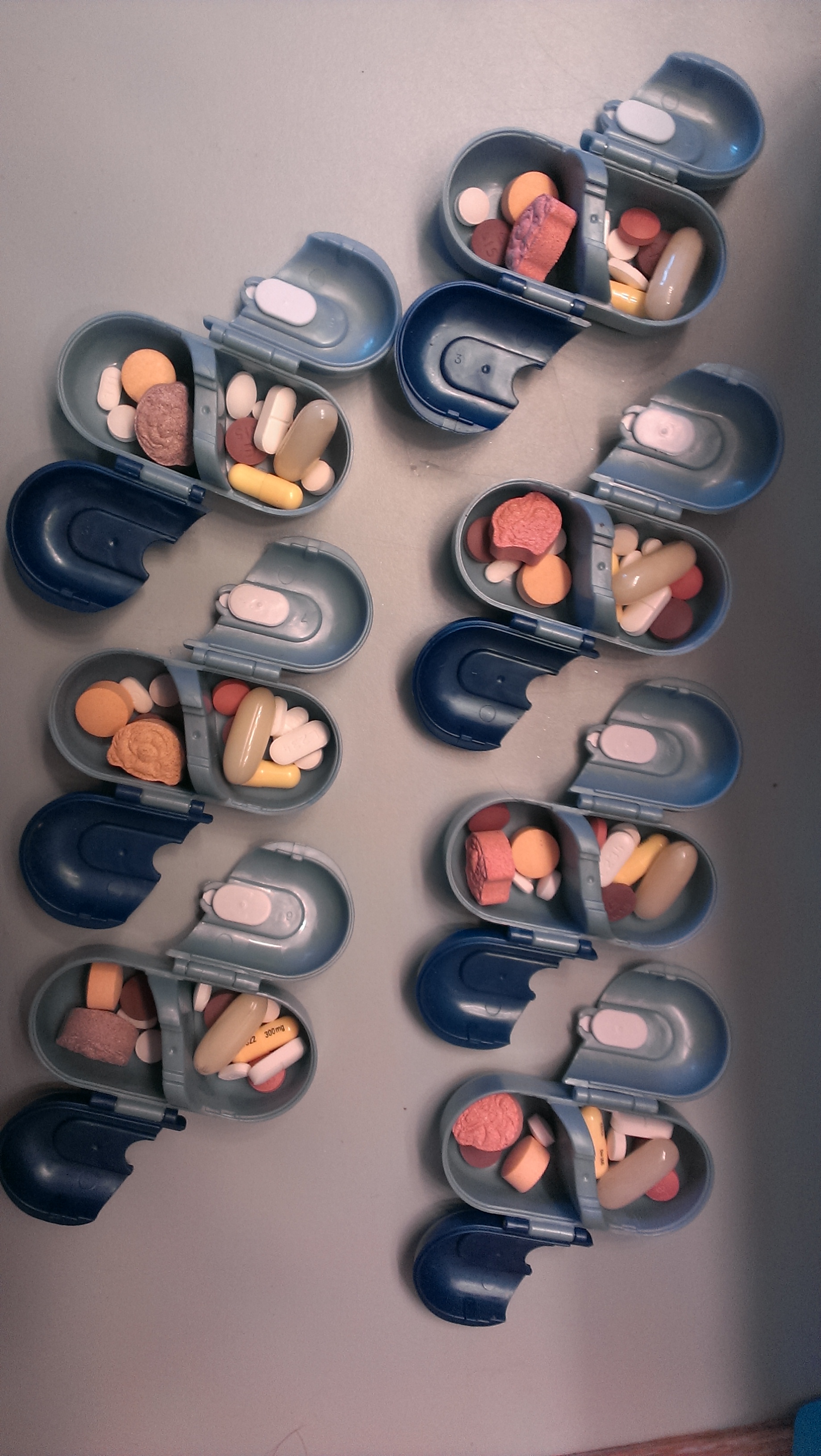 I imagine a lot of people out there share my weekly regime of tipping pills from many bottles into little plastic containers that mark the days by day and night. Times were, I took nothing (though my recurrent anemia said I really ought to be taking iron, and my living in Oregon says some vitamin D would be good). Occasionally I’d get a wild hair and buy some supplements and taking them maybe a week or two before I tired of it. I don’t have the luxury of tiring of it and setting the pills aside anymore, so once a week, I pull many bottles off of the apothecary shelves, and count them out into little daily pods.