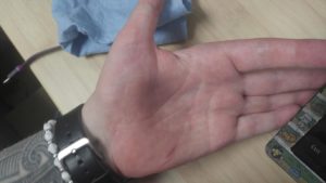 If I had to be hit by a car, this was totally the way to go. It was the gentlest of impacts ever, the equivalent of someone slowly leaning on me until the walker got pushed over and me with it. I scraped up my knee and my elbow, and got a little road rash on my hand. That’s all. The worst part was spilling my breakfast leftovers. J’s dad banged on the trunk of the car to alert her to our presence, which brought her to a stop; if he hadn’t, I’d likely have been hurt worse. The car and my walker traded a little paint, instead of her going over me completely.